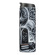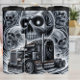 Esta imagen monocromática presenta un poderoso semicírculo negro con detalles estilizados y giratorios de plata, ambientado en un contexto de fantasmal humo blanco y numerosas calaveras amenazadoras de diferentes tamaños. Los cráneos parecen emerger de la neblina humeante, creando una atmósfera oscura y gótica alrededor del camión.