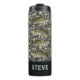 A green and brown camo design with a pattern of trophy largemouth bass The bottom of the tumbler has a diamond plate pattern where the name can be personalized. This tumbler is great for the fishing fanatic in your life.