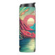 Camping temática personalizada tumbler. Los gráficos son de un camping de color rosa y verde azulado con una tienda, una puesta de sol, lagos y pinos.