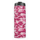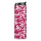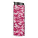 Este tumbler térmico de camo giratorio presenta un patrón de camuflaje en tonos rosa oscuro y rosa pálido.