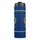 Una botella térmica personalizada con su capitán de rango u otro título y su nombre, apellido u otro texto deseado. Con un ancla náutica diseñada por un personalizado, hojas de laurel de estilo dorado y emblema estrella sobre azul marino. Cambia fácilmente el color de fondo para que coincida con tu decoración o temática actual. Hace un gran regalo para cualquier ocasión.