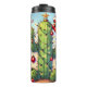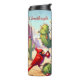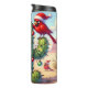 Este ilustracion divertido y caprichoso presenta varios cardenales rojos con sombreros de Santa mientras decoran un gran cactus de saguaro con luces de Navidad y adornos. La escena se encuentra en un soleado paisaje desértico, con montañas como telón de fondo, ofreciendo una toma única y encantadora en una celebración de vacaciones.