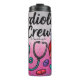 A vibrant, glitter-textured background in pink and grey highlights a "Cardiology Crew" design, featuring a stylized anatomical heart, a stethoscope, and an oxygen tank. Pills, a medical cross, and an electrocardiogram line further detail the theme. "K.Smithright" is subtly integrated, making it a personalized tribute for a cardiac care professional.. Replace the name with your name