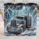 Esta imagen muestra un poderoso camión semicromado que avanza a toda velocidad por una autopista durante una fuerte tormenta. Tornillos de brillantes rayos blancos y azules electrifican el tormentoso y oscuro paisaje que rodea el camión. El agua se desplaza alrededor del vehículo a medida que avanza, enfatizando la intensidad del tiempo y la presencia contundente del camión.