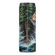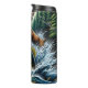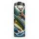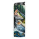 Este dinámico ilustracion capta una animada escena al aire libre, centrada en una lubina de boquilla que salta vigorosamente del agua turbulenta en primer plano. Sus escalas son verdes y amarillas, y los peces más pequeños nadan por debajo en el agua azul turbia. En el fondo, un majestuoso ciervo con cornisas es también un salto intermedio, creando un resplandor a medida que emerge de un denso bosque de pinos verde oscuro. La impresión general es de vida silvestre activa y la emoción de la caza o la pesca en la naturaleza.
