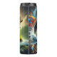 Una escena dinámica que capta la fauna acuática y terrestre. Una gran lubina con aletas vibrantes salta espectacularmente del agua, creando salpicaduras, mientras que un majestuoso ciervo con cuernos descansa serenamente en la orilla. Las varas de pesca son parcialmente visibles en el agua, lo que sugiere interacción humana con la naturaleza, ambientadas en un telón de fondo de densos bosques verdes.
