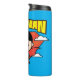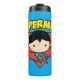 Echa un vistazo a Chibi Superman volando en las nubes con su súper nombre de héroe sobre la cabeza y forma de escudo de puntos de polka rojo detrás de él.