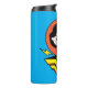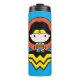 Echa un vistazo a Chibi Wonder Woman encima de su logotipo WW, con tornillos relámpago, fondo de punto de polka rojo, y su nombre escrito sobre la cabeza.