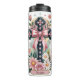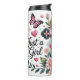 Una elegante cruz oscura, adornada con un suave arco rosado, está rodeada por un caprichoso arreglo de rosas rosas rosas, margaritas blancas, hojas verdes y pequeños corazones rosados. Dos mariposas rosas y negras revolotean cerca. Las frases "Just a Chica" y "Who Loves Jesus" se incorporan de manera lúdica al diseño en una mezcla de escritura y fuentes impresas, creando una imagen dulce e inspirada en la fe.
