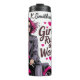 Este ilustracion gráfico presenta a una mujer segura de sí misma con pelo rosa brillante corto y gafas de sol elegantes, montada en motocicleta. Ella lleva puesto una chaqueta de cuero negro y un top rosado. Las palabras "los Chicas gobiernan el mundo" están escritas en negrita junto a ella, rodeadas de corazones rosados y una salpicadura de purpurinas rosados. El arte tiene un ambiente poderoso, moderno y fortalecedor.