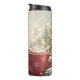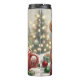 A heartwarming and cozy holiday image centered around a light brown teddy bear. The bear is dressed warmly in a knitted, deep red pom-pom hat and a green and red striped scarf. It is sitting on a white, fluffy surface, surrounded by small gift boxes and classic red and green Christmas ornaments. Prominently featured is a red mug decorated with white snowflakes, filled with steaming hot chocolate. The beverage is topped with whipped cream, a tiny snowman-shaped marshmallow, and a miniature candy cane. The background is soft and blurred, featuring glowing bokeh string lights and decorated Christmas trees, setting a magical and traditional holiday atmosphere