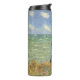 Cliff Walk at Pourville (1882) by Claude Monet is a vintage impressionism fine art nautical painting. A seascape featuring two women standing on a rocky sea cliff. The ladies are carrying parasols and overlooking waves on the ocean on a sunny summer day.