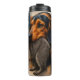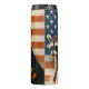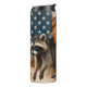 Un perro leal, posiblemente un Coonhound Negro y Tan, abraza cariñosamente un mapache, presentando una escena inusual pero reconfortante de compañerismo entre especies. Detrás de ellos, una bandera rústica estadounidense sirve como telón de fondo patriótico, sugiriendo un tema de vida rural y amistades inesperadas. El estilo de la obra destaca las expresiones suaves de los animales.