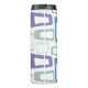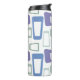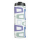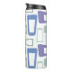 Esta botella térmica tiene un diseño moderno de mediados de siglo de repetición de paralelogramas en azul y verde con paralelogramas blancos encima. Como este diseño pero ¿quieren colores diferentes? Mándame un mensaje.