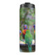 Grupo de coloridas aves exóticas reunidas alrededor de una mesa de alimentación.
