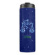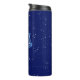Tumbler en el signo zodiaco de Libra en azul plateado suave, cubierto con las estrellas de la constelación, contra un fondo cielo estrellado de azul oscuro
