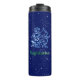 Tumbler en el signo zodiaco de Sagittarius en azul plateado suave, cubierto con las estrellas de la constelación, contra un cielo estrellado de fondo azul profundo de medianoche