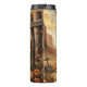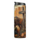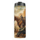 Esta imagen muestra a un vaquero descansando, sentado con la cabeza baja, al lado de un caballo ensillado bajo una gran cruz de madera en un paisaje desértico. La escena se encuentra en un telón de fondo de imponentes formaciones rojas bajo un cielo turbio y cálido. En primer plano hay cactus, flores silvestres y rocas esparcidas, con una cruz más pequeña a la izquierda. La impresión general es de soledad y contemplación en la agreste selva.