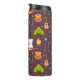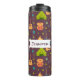 Una botella de agua termal con un divertido patrón temático de camping. Sobre un fondo marrón rojizo. Los elementos en el patrón incluyen una fogata, una tienda, una guitarra, una pala y una mochila. Personaliza con un nombre.