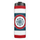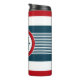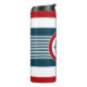Diseño náutico con decoración de brújula en forma redonda sobre fondo rayado azul, rojo y blanco
