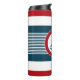 Diseño náutico con decoración de velero en forma redonda sobre fondo rayado azul, rojo y blanco