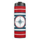 Diseño náutico con decoración de brújula en forma redonda sobre fondo rayado rojo, azul y blanco