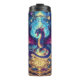 Este ilustracion vibrante y místico cuenta con un majestuoso dragón con grandes alas coloridas en tonos azules, violetas y amarillos. El dragón se coloca sobre una mandala dorada intrincada y brillante sobre un fondo cósmico lleno de estrellas, planetas y energía etérea. El estilo general es luminoso, detallado y de otra índole, lo que sugiere un ser poderoso y mágico.