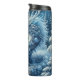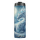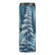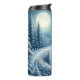 Un majestuoso dragón blanco y azul glacial con detalles intrincados y ojos azules brillantes descansa en un bosque nevado bajo la luz de una gran luna llena y estrellas brillantes. Los pinos recubiertos de nieve rodean la magnífica criatura, creando una mágica escena de invierno.