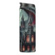 Un dragón rojo con ojos brillantes rodea un castillo gótico bajo un cielo nocturno tormentoso. La lucha se extiende a través de la arquitectura antigua mientras las sombras se extienden por el paisaje. Esta vívida escena de fantasía combina magia, amenaza y leyenda medieval en un momento intenso y poderoso de narración y atmósfera surrealista.