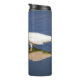 Un tumbler térmico envuelto con una foto de una gran garganta y su reflejo mientras cazaba. Foto de Karla Chrast