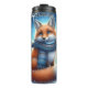 Este encantador ilustracion de invierno cuenta con un zorro rojo adorable con ojos azules brillantes, que lleva una bufanda gruesa y con motivos azules y blancos. El zorro está sentado en un paisaje boscoso de nieve, con árboles cubiertos de escarcha, delicados músculos colgados de ramas y suave nevada, creando una escena de invierno mágica y acogedora.
