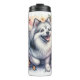 Un flamante perro esquimal americano con una expresión alegre, jadeante, se posa alegremente en medio de una vibrante y colorida variedad de girasoles, peonías púrpura y delicadas flores rosadas. Las salpicaduras de color agua y las mariposas le dan un toque artístico y caprichoso a este encantador retrato canino.