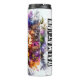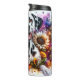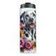 Un feliz dálmata con su característico abrigo manchado y una sonrisa de boca abierta está rodeado por una vibrante y colorida variedad de girasoles, peonías rosadas y daisies moradas. Las salpicaduras de acuarela artística le dan un toque dinámico a la alegre escena floral.