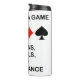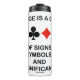 Muestra tu lado del puente irónico con este tumbler térmico con los cuatro trajes de cartas junto con el truismo del puente diciendo: "El puente es un juego de Rótulos, símbolos y significancia". ¡Haz que otros hagan una doble jugada sobre lo que es el juego del puente la próxima vez que tomes un sorbo de este vaso termal!