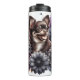Un encantador Chihuahua de cabello largo con una expresión feliz, jadeante, se esconde en medio de un sereno jardín de girasoles y rosas de escala griega. Sutiles toques de color morado y azul en el fondo dan un toque de color, creando un elegante y artístico retrato floral de esta querida raza.