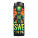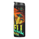 Un ilustracion vibrante representa a un gran y pequeño extraterrestre verde parado juntos contra un naranja estilizado y la puesta de sol amarilla. Varios platillos voladores descienden con vigas ligeras. El texto "ROSWELL NATION PARK" sugiere una visión humorística y familiar de los encuentros extraterrestres en Estados Unidos.