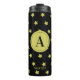 This design features a bold and luxurious pattern of shimmering gold stars set against a rich black background, creating a striking contrast. The elegant monogram detail adds a personalized touch, blending classic sophistication with modern celestial style. Perfect for making a refined, high-impact statement.