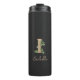 Elegante tumbler térmico negro con monograma botánico dorado en el centro.