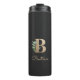 Elegante tumbler térmico negro con monograma botánico dorado en el centro.