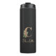 Elegante tumbler térmico negro con monograma botánico dorado en el centro.