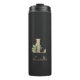 Elegante tumbler térmico negro con monograma botánico dorado en el centro.