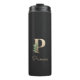 Elegante tumbler térmico negro con monograma botánico dorado en el centro.