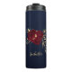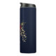 Elegantes flores borgoña con algunas hojas doradas románticas sobre fondo azul marino tumbler térmico