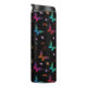 Un tumbler termal diseñado con un elegante patrón con un ilustracion gráfico de mariposas revoloteadoras en muchos colores brillantes, que contrasta muy bien con el fondo negro. Flores, estribos y hojas caprichosas añaden un poco de encanto. Un marco negro con un borde de color dorado sobre la parte superior con tu texto personalizado dentro.