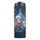 Un elfo alegre que brilla con su largo y florido cabello azul. Su cabello parece brillar en la luz suave, dándole un brillo mágico. En su cabeza usa un lindo gorra de Navidades azules adornado con una pompa blanca que concuerda perfectamente con su atuendo. Su cálida sonrisa irradia alegría y calidez, dando a los espectadores un sentido de anticipación festiva. El fondo del diseño está formado por elegantes árboles blancos de Navidad y el cielo está salpicado de brillantes estrellas blancas que brillan como pequeños diamantes, creando una atmósfera mágica.