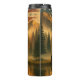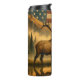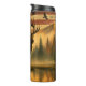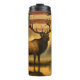 Un majestuoso alce con impresionantes cordones se encuentra en aguas poco profundas, reflejando el cálido resplandor de una puesta de sol. En el fondo, se ven montañas escarpadas y densos bosques de pino bajo una estilizada bandera estadounidense, con dos águilas por encima, creando una gran escena patriótica de la naturaleza salvaje.