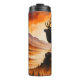 Un majestuoso alce se erige sobre un promontorio rocoso, dominando un vasto y neblinoso valle de montaña bañado por el intenso resplandor de una puesta de sol. Un río serpentea a través del paisaje, reflejando el vibrante cielo. En primer plano, un fotógrafo solitario captura la impresionante escena, enfatizando la grandeza de la naturaleza y la vida salvaje.