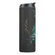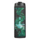 A bold and eye-catching insulated travel mug featuring a detailed beetle set against a vibrant emerald island. The rich green tones contrast beautifully with the dark background, creating a striking and artistic look.