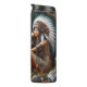 Una serena nativa norteamericana, adornada con un vibrante tocador de plumas y un atuendo tradicional, se sienta cuidadosamente por una acristalada fogata. Un fiel lobo gris se sienta tranquilamente a su lado y su mirada refleja el entorno tranquilo del bosque. Árboles lejanos y otros animales pequeños añaden a este apacible paisaje salvaje, encarnando armonía con la naturaleza.