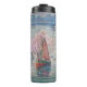 Many sailboats with colorful sails can be seen going in and out of the harbor in this nautical maritime scene.